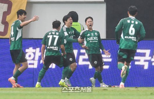 전북 현대 이승우(오른쪽 둘째)가 6일 서울월드컵경기장에서 열린 2025 하나은행 코리아컵 광주FC와의 결승전에서 연장 전반 결승골을 넣은 뒤 동료들과 함께 기뻐하고 있다. 전북은 K리그1에 이어 코리아컵까지 우승하며 더블을 달성했다. 2025. 12. 6.