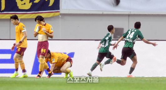 전북 현대 이승우(오른쪽 둘째)가 6일 서울월드컵경기장에서 열린 2025 하나은행 코리아컵 광주FC와의 결승전에서 연장 전반 결승골을 넣은 뒤 전진우와 함께 기뻐하고 있다. 전북은 K리그1에 이어 코리아컵까지 우승하며 더블을 달성했다. 2025. 12. 6.