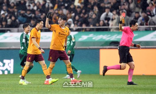 전북 현대 이승우(맨 왼쪽)가 6일 서울월드컵경기장에서 열린 2025 하나은행 코리아컵 광주FC와의 결승전에서 위험한 플레이로 박병진 주심으로부터 레드카드를 받고있다. 2025. 12. 6.박진업 기자 upandup@sporttsseoul.com [기사제보 news@sportsseoul.com] Copyright ⓒ 스포츠서울&sportsseoul.com