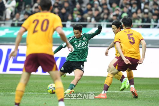 전북 현대 송민규(가운데)가 6일 서울월드컵경기장에서 열린 2025 하나은행 코리아컵 광주FC와의 결승전에서 슛을 하고 있다. 2025. 12. 6.박진업 기자 upandup@sporttsseoul.com [기사제보 news@sportsseoul.com] Copyright ⓒ 스포츠서울&sportsseoul.com