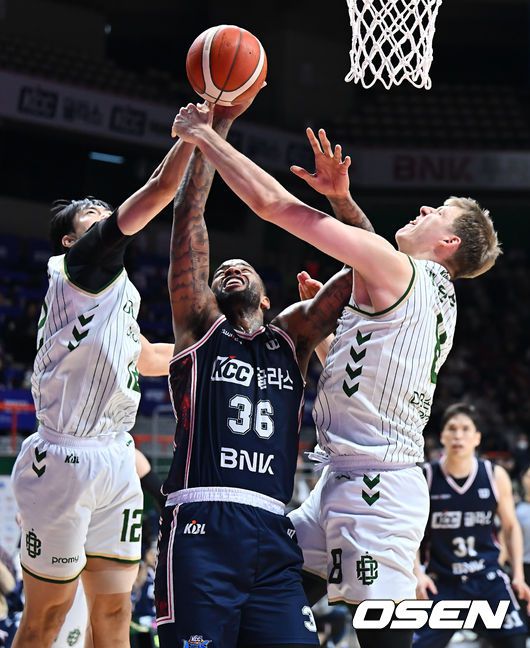 부산 KCC 숀롱이 원주 DB 정효근, 엘런슨의 마크를 피해 골밑슛을 시도하고 있다. 2025.12.06 / foto0307@osen.co.kr