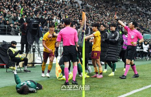 광주FC 조성권(왼쪽 둘째)가 6일 서울월드컵경기장에서 열린 2025 하나은행 코리아컵 전북 현대와의 결승전에서 전북 이승우(맨 왼쪽)을 넘어뜨리는 행위로 박병진 주심으로부터 레드카드를 받고 있다. 2025. 12. 6.박진업 기자 upandup@sporttsseoul.com [기사제보 news@sportsseoul.com] Copyright ⓒ 스포츠서울&sportsseoul.com