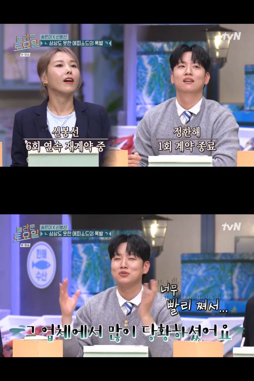 그러자 한해가 씁쓸한 표정을 지어 웃음을 자아냈다. 한해는 신봉선이 광고 중인 브랜드와 경쟁 관계에 있는 다이어트 업체와 계약했으나, 단 1회 만에 종료됐던 경험이 있다. 그는 “그 업체에서 많이 당황하셨다. 제가 너무 빨리 쪄서…”라며 민망한 소회를 털어놨다.