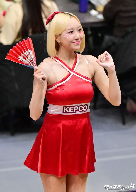 (엑스포츠뉴스 수원, 김한준 기자) 5일 오후 경기도 수원실내체육관에서 열린 '진에어 2025-2026 V-리그' 한국전력과 OK저축은행의 경기, 박성은 치어리더가 열띤 응원을 선보이고 있다.김한준 기자 kowel@xportsnews.com