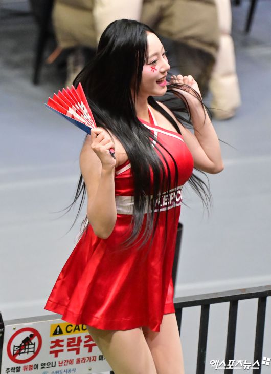 (엑스포츠뉴스 수원, 김한준 기자) 5일 오후 경기도 수원실내체육관에서 열린 '진에어 2025-2026 V-리그' 한국전력과 OK저축은행의 경기, 김민서 치어리더가 열띤 응원을 선보이고 있다.김한준 기자 kowel@xportsnews.com