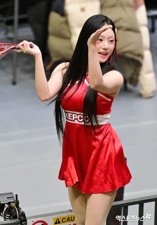 (엑스포츠뉴스 수원, 김한준 기자) 5일 오후 경기도 수원실내체육관에서 열린 '진에어 2025-2026 V-리그' 한국전력과 OK저축은행의 경기, 김민서 치어리더가 열띤 응원을 선보이고 있다.김한준 기자 kowel@xportsnews.com