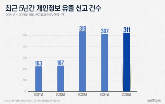 7일 국민의힘 박충권 의원실이 개인정보보호위원회(개보위)로부터 받은 자료에 따르면 올해 1월부터 9월까지 접수된 개인정보 유출 신고는 311건이다. 이같은 수치는 지난해 307건과 비슷한 수준인데, 올해 11월 쿠팡의 대규모 유출 사태와 남은 기간을 고려하면 사실상 더 많은 개인정보 유출 신고가 있었을 것으로 보인다.