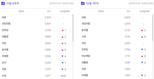 이 같은 장 대표의 강경 노선은 온라인 여론에도 반영됐다. 뉴스 보도를 제외하고도 각종 SNS·커뮤니티에서 장 대표의 연관어로 ‘윤석열’과 ‘사과’의 언급량 순위가 각각 3위와 4위로 올라서며 직전 주에 비해 상승했다. 같은 날 계엄 관련 메시지를 낸 윤석열 전 대통령과 함께 거론되는 사례가 늘면서 ‘사과 거부’를 둘러싼 다양한 의견이 온라인에서 확산된 것으로 보인다.