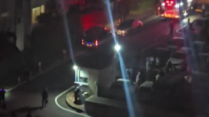 어두운 밤, 건물 밖으로 새어 나온 희뿌연 연기가 하늘을 가득 메웁니다.