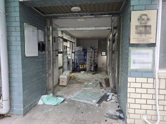 피의자 A씨가 차량으로 돌진해 파손된 관리사무소. 사진=SNS 갈무리 |
