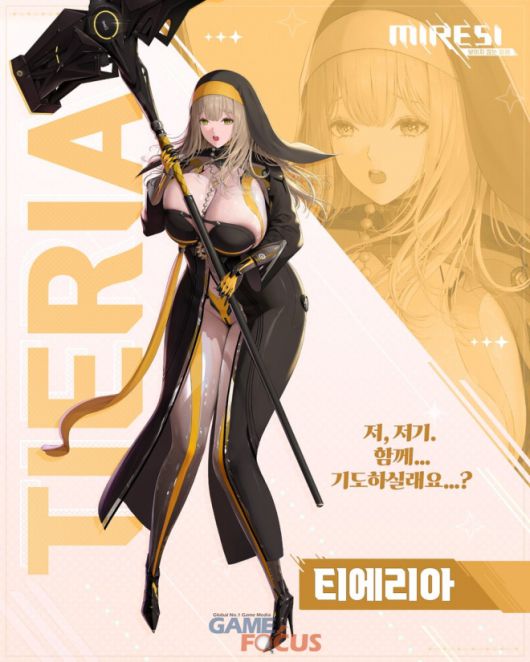 ‘티에리아’는 차분하고 상냥한 수녀 콘셉트의 캐릭터다. 종교적 이미지에 과학기술을 결합한 외형을 지닌 사이보그 수녀이며, 성스러운 캐릭터가 전장에서 과격한 전투 스타일을 보여주는 반전 매력을 담았다. 누구에게나 상냥하지만, 주인공을 대할 때는 부끄러움을 타는 성격적 매력도 담았다.