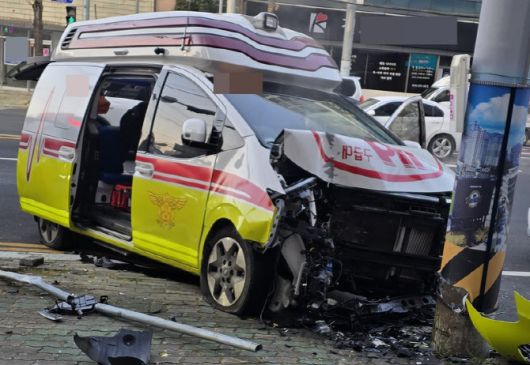 7일 오전 8시 20분께 경남 창원시 마산회원구 합성동 한 도로에서 환자를 태우고 달리던 구급차가 인도 위 전봇대와 도로 표지판을 들이받았다.