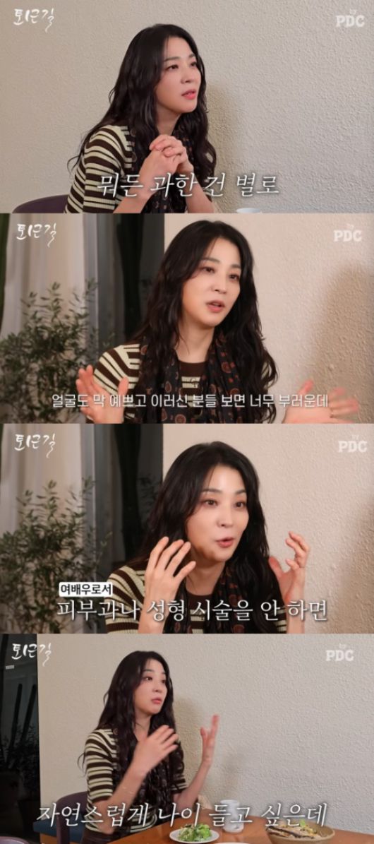 "나이가 들면서 뭐든 과한 건 별로"라는 한고은은 "적당한 게 좋다. 물론 몸매도 애플힙 있고 얼굴 예쁘신 분들 보면 너무 부러운데 그렇게까지는 하고 싶지 않다. 이게 딜레마다. 여배우로서 피부과나 성형 시술을 안 하면 관리 안 한다는 얘기를 듣는데, 반대로 뭘 하면 인조인간 같다더라"라고 털어놨다.
