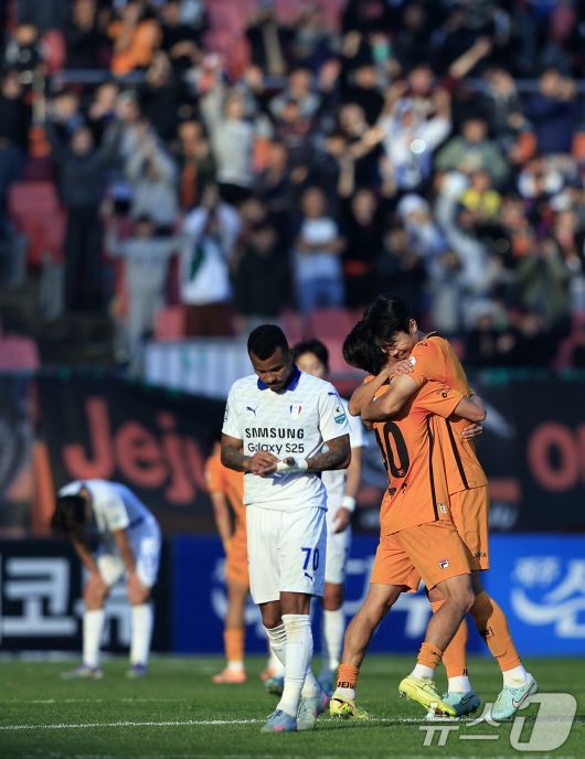 (제주=뉴스1) 박정호 기자 = 7일 오후 제주 서귀포시 월드컵로 제주월드컵경기장에서 열린 하나은행 K리그 승강 플레이오프 2025 2차전 제주SK와 수원삼성의 경기에서 2대0 승리(1,2차전 합산 3대0)를 거두며 잔류를 확정한 제주 선수들이 기뻐하고 있다. 2025.12.7/뉴스1