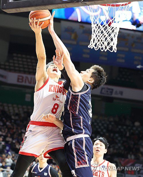 (부산=연합뉴스) 강선배 기자 = 7일 부산 사직실내체육관에서 열린 2025-2026 프로농구 부산 KCC 이지스와 서울 SK 나이츠의 경기. SK 안영준이 골 밑 돌파하다 패스하고 있다. 2025.12.7