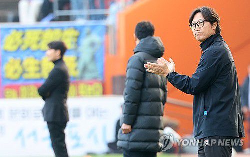 (서귀포=연합뉴스) 박지호 기자 = 7일 오후 서귀포시 제주월드컵경기장에서 하나은행 K리그 2025 승강 PO 2차전 제주SK와 수원삼성의 경기 후반 제주 김정수 감독대행이 선수들을 독려하고 있다. 2025.12.7