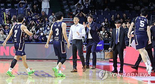 (부산=연합뉴스) 강선배 기자 = 7일 부산 사직실내체육관에서 열린 2025-2026 프로농구 부산 KCC 이지스와 서울 SK 나이츠의 경기. KCC 이상민 감독이 4쿼터 막판 리드폭을 늘리자 미소 짓고 있다 2025.12.7
