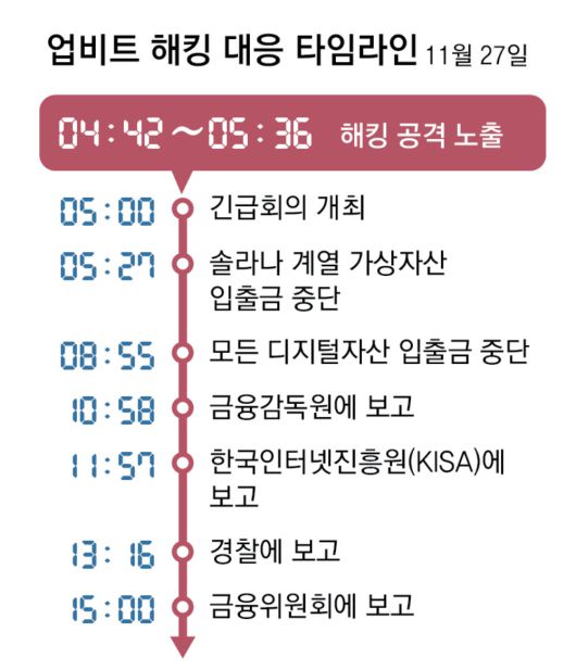 업비트는 금융 당국에 오전 10시 58분에야 해킹 사건을 보고했다. 사건 발생 후 6시간이 지난 뒤였다. 이날 오전 9시 반에는 송치형 두나무 회장과 이해진 네이버 의장이 공식 석상에 나와 업비트와 네이버파이낸셜의 합병을 알리는 행사가 예정돼 있었다.