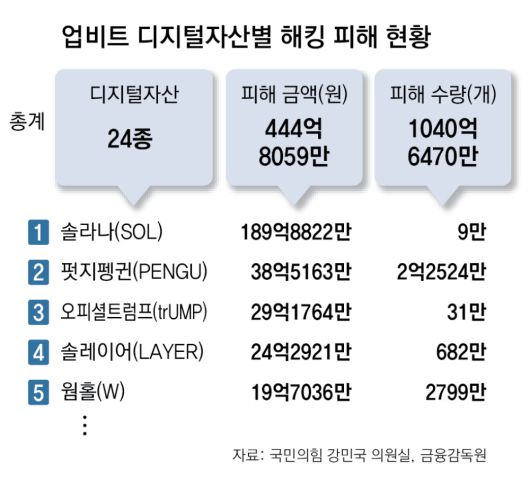 7일 국회 정무위원회 소속 강민국 의원실이 금융감독원에서 제출받은 자료에 따르면 이번에 해킹당한 솔라나 계열 24종 코인 중 회원 피해 자산은 약 386억 원 규모다. 업비트는 이 중 약 23억 원을 동결했다. 업비트 회사 피해 자산은 약 59억 원이다.