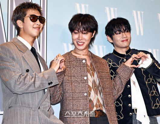 RM(왼쪽)이 한 행사에서 제이홉, 뷔(오른쪽)와 포즈를 취하고 있다. 이주상기자 rainbow@sportsseoul.com |