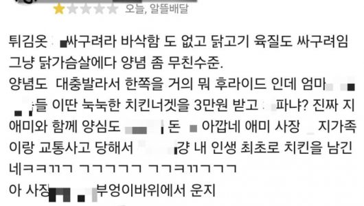 자영업자 A씨가 "신고할 수 있느냐"며 공개한 리뷰에는 "튀김이 바삭하지도 않고 육질도 싸구려다. 그냥 닭가슴살에다 양념 좀 무친 수준"이라며 "양념도 대충 발라서 한쪽은 거의 후라이드인데 엄마 XX XX들, 이걸 3만원 받고 파냐"는 식의 내용이 담겼있었다.