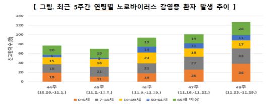 8일 질병관리청은 병원급 210개소의 장관감염증 표본감시 결과 노로바이러스 감염증 환자 수가 127명으로 집계됐다고 밝혔다. 이는 지난해 11월 5주(80명) 동기간 대비 58.8% 증가한 것이다.