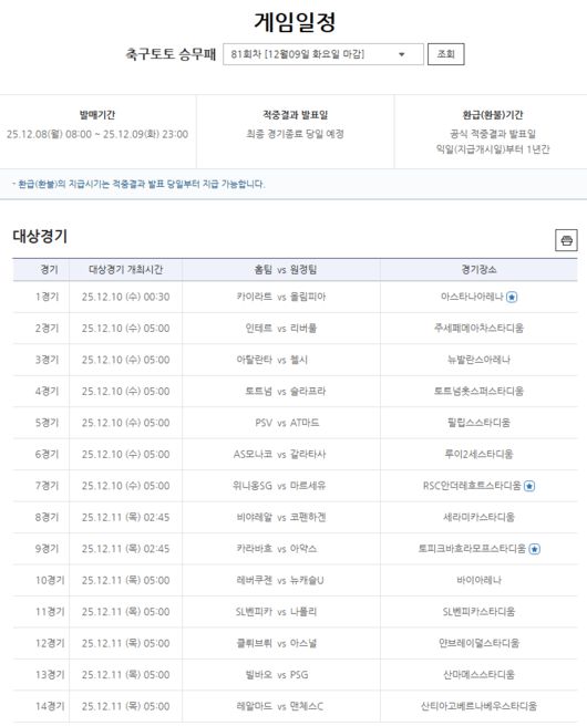 한편, 축구토토 승무패 81회차는 오는 8일(월) 오전 8시부터 9일(화) 오후 11시까지 참여할 수 있으며, UEFA 챔피언스리그(UCL) 리그페이즈 주요 빅매치들이 대거 포함됐다.