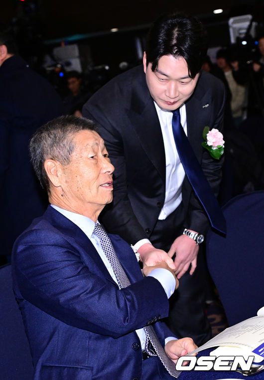 [OSEN=최규한 기자] 8일 오전 서울 청담동 리베라호텔에서 ‘2025 일구상 시상식’이 열렸다. 이번 일구상은 최고투수상 삼성 원태인, 최고타자상 키움 송성문, 신인왕으로 KT 안현민을 선정했다. 김성근 전 감독과 오승환이 인사를 나누고 있다. 2025.12.08 / dreamer@osen.co.kr