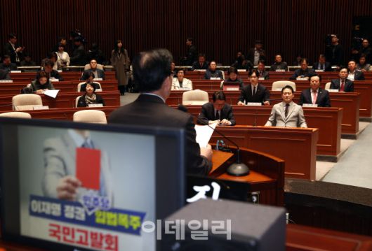 [이데일리 노진환 기자] 송언석 국민의힘 원내대표가 8일 서울 여의도 국회에서 열린 의원총회 및 이재명 정권 독재악법 국민고발회에서 모두발언을 하고 있다.
