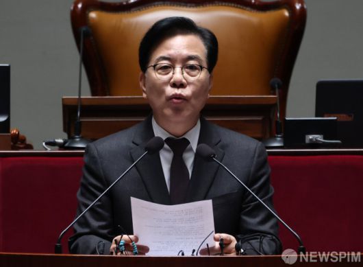 [서울=뉴스핌] 최지환 기자 = 송언석 국민의힘 원내대표가 8일 오전 서울 여의도 국회에서 열린 국민의힘 의원총회 및 이재명 정권 독재악법 국민고발회에서 발언하고 있다. 2025.12.08 choipix16@newspim.com