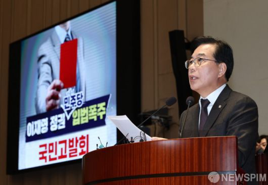 [서울=뉴스핌] 최지환 기자 = 송언석 국민의힘 원내대표가 8일 오전 서울 여의도 국회에서 열린 국민의힘 의원총회 및 이재명 정권 독재악법 국민고발회에서 발언하고 있다. 2025.12.08 choipix16@newspim.com
