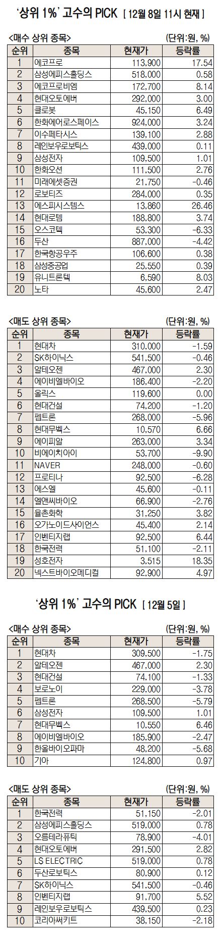 반면 이날 초고수 투자자들이 가장 많이 순매도한 종목은 현대차(005380), SK하이닉스(000660), 알테오젠(196170), 에이비엘바이오(298380) 등으로 나타났다. 전날 기준 순매수 상위 종목은 현대차, 알테오젠, 현대건설(000720), 보로노이(310210)였으며, 순매도 상위에는 한국전력, 삼성에피스홀딩스, 오름테라퓨틱, 현대오토에버 등이 올랐다.