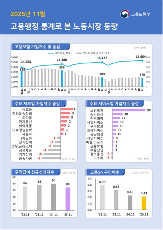 8일 고용노동부가 발표한 '2025년 11월 고용행정 통계로 본 노동시장 동향'에 따르면 지난달 고용보험 상시가입자는 1565만4000명으로 전년 대비 17만8000명(1.1%) 증가했다.