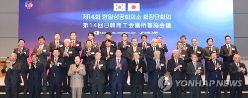 (서울=연합뉴스) 8일 제주 신라호텔에서 열린 '제14회 한일 상의 회장단 회의'에서 최태원 대한상의 회장(앞줄 왼쪽 여섯 번째)과 고바야시 켄 일본상의 회장(앞줄 왼쪽 일곱 번째) 등 참석자들이 기념 촬영하고 있다. 2025.12.8 [대한상공회의소 제공. 재판매 및 DB 금지]