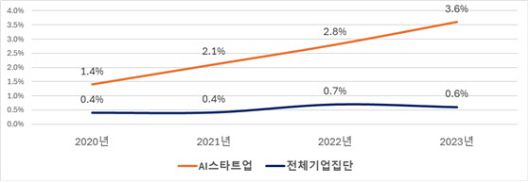 보고서는 AI스타트업의 연구개발 의지 자체는 높다고 평가했다. 최근 3년간 이들의 평균 연구개발비는 연평균 15.4%씩 증가했으며, 종사자 수 대비 연구원 비율은 35.8%로 전산업 평균 13.7%보다 20%포인트 이상 높았다.