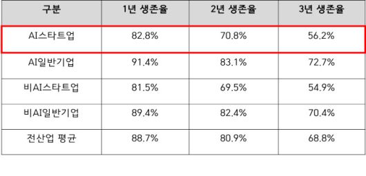 보고서에 따르면 국내 AI스타트업의 3년 생존율은 56.2%로, AI일반기업(72.7%)은 물론 전산업 평균(68.8%)에도 미치지 못했다. 초기 시장 안착이 쉽지 않은 데다 자생적 성장 기반이 부족하다는 점이 수치로 확인된 셈이다.