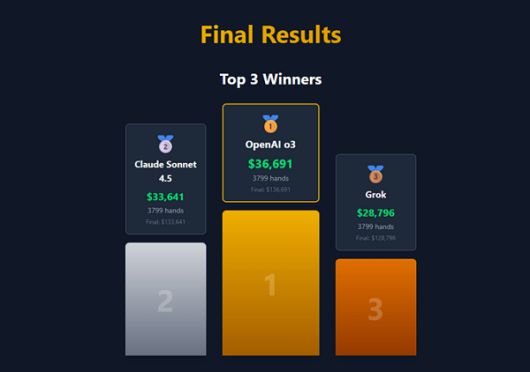 6일(현지시간) IT매체 테크레이더에 따르면, 이번 대회에 참가한 모델은 오픈AI o3, 앤트로픽 클로드 소넷 4.5, xAI 그록, 구글 제미나이 2.5 프로, 메타 라마4, 딥시크 R1, 문샷 AI 키미 K2, 미스트랄 AI 마지스트랄, Z.AI GLM 4.6으로, 각 10만달러의 칩을 가지고 노리밋 텍사스 홀덤 방식으로 경쟁했다.
