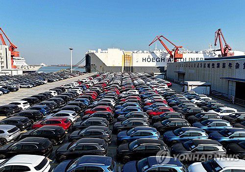 중국 동부 장쑤성 롄윈강에서 수출 대기 중인 자동차들 |