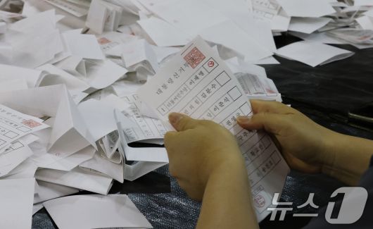 제21대 대통령 선거 투표가 실시된 대전 서구 KT인재개발원에 마련된 개표소에서 개표사무원들이 투표용지를 분류하고 있다. 2025.6.3/뉴스1 ⓒ News1 김기태 기자 |