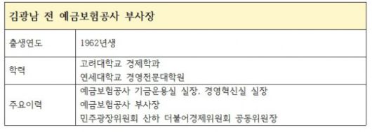 김광남 전 부사장은 예금보험공사에서 기금운용실 실장, 경영혁신실 실장, 저축은행관리부 부장, 기획조정부 부장 등을 역임했다. 부사장을 지낸 후 사장직에도 출사표를 던진 것으로 알려졌지만 사장직에 오르지는 못했다. 김 전 부사장은 이재명 대통령이 후보시절 만들었던 직속기구인 경제자문 정책기구 ‘더불어경제위원회’의 공동 위원장을 지낸 이력이 있다.