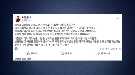 나 의원은 오늘(8일) SNS에 글을 올려 대통령이 일찌감치 여권의 다른 서울시장 후보들은 퇴짜를 놓았는데 김현지 실장이 낙점한 거냐며, 사실상 여당 서울시장 후보를 겨냥한 '명심 주문'이자 '대통령 발 사전선거운동'이라고 지적했습니다.