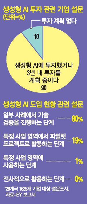 EY가 올해 한국을 포함한 26개국 1635개 기업을 대상으로 조사해 발표한 '미래 산업의 재구성' 보고서를 보면, 생성형 AI에 투자하고 있다고 응답한 기업이 47%, 향후 3년 이내 투자할 계획이 있다고 응답한 곳이 43%로 집계됐다. 10곳 중 9곳의 기업은 생성형 AI에 투자했거나 투자를 고려하고 있다는 것을 볼 때 기업들의 높은 생성형 AI 관심도를 확인할 수 있다. 다만 관심도에 비해 생성형 AI 상용화 수준은 아직 저조한 상태다. 기업들의 생성형 AI 도입 수준을 묻는 질문에 99%의 기업이 제한된 영역에서 기술검증을 진행하거나 파일럿 프로젝트로 생성형 AI를 활용해보고 있다고 응답했으며, 사업에 본격적으로 배포해 사용한다고 응답한 곳은 1%에 불과했기 때문이다.