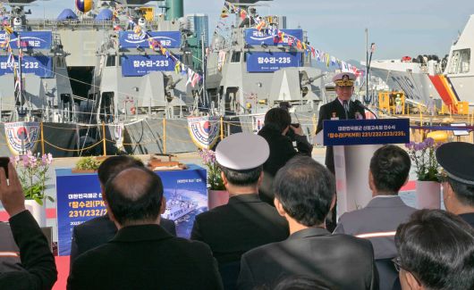 해군은 8일 부산 HJ중공업 영도조선소에서 신형고속정(PKX-B) Batch-II 참수리-231·232·233·235호의 통합진수식을 가졌다고 밝혔다.