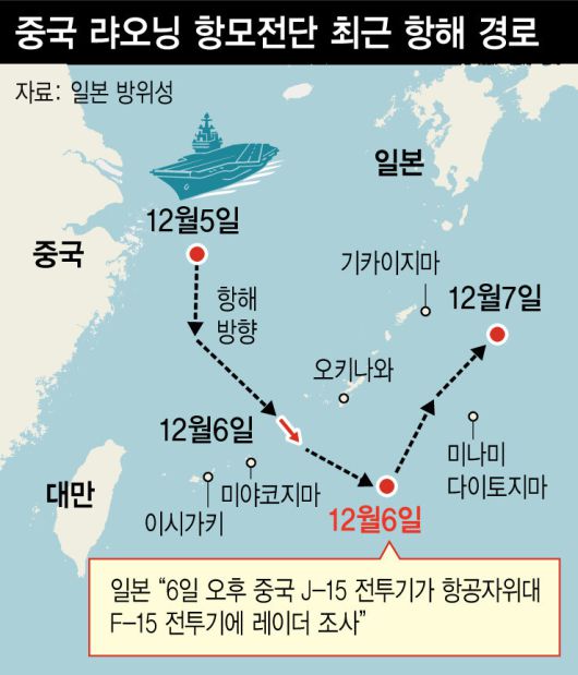 앞서 고이즈미 신지로 일본 방위상은 주말인 7일 새벽 2시4분께 긴급 기자회견을 열어, 6일 오후 4시32분~4시35분 사이 그리고 저녁 6시37분~7시8분 사이에 각각 오키나와 본섬 남동부 공해상에서 중국 항공모함 ‘랴오닝’에서 발진한 J-15 전투기가 항공자위대 F-15 전투기에 레이더를 조사했다고 발표했다.
