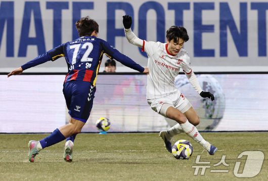 (수원=뉴스1) 구윤성 기자 = 8일 오후 경기 수원시 장안구 수원종합경기장에서 열린 하나은행 K리그 승강 플레이오프(PO) 2차전 수원FC와 부천FC의 경기, 부천FC 김규민이 전반전 상대 문전으로 드리블 돌파를 하고 있다. 2025.12.8/뉴스1kysplanet@news1.krCopyright ⓒ 뉴스1. All rights reserved. 무단 전재 및 재배포, AI학습 이용 금지.
