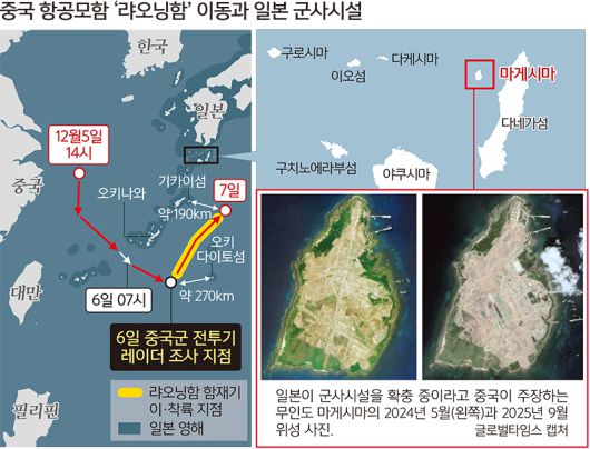 중국은 이날 일본 무인도 군사시설 사진을 공개하며 일본을 비판했다. 중국 관영 글로벌타임스는 일본 서남부 무인도인 가고시마현 마게시마에 일본 측이 군사시설을 빠르게 건설하고 있다고 보도했다. 지난해 5월 촬영한 위성사진에는 보이지 않던 2㎞급 활주로와 탄약고, 저장탱크, 대형 군함 접안이 가능한 임시 부두 등 군사시설이 올해 9월 사진에는 확인된다는 것이다. 그러면서 “일본이 대만 문제에 군사적으로 개입하기 위한 준비다. 일본은 유사시 이 기지를 활용해 중국 해군의 국제해역 통과 차단을 시도할 수 있다”는 중국 군사전문가의 주장을 전했다.