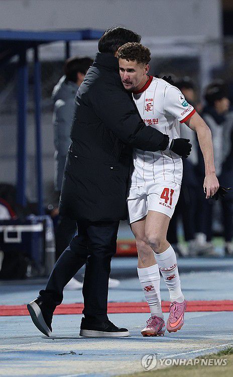(수원=연합뉴스) 이지은 기자 = 8일 수원종합운동장에서 열린 프로축구 승강 플레이오프 2차전 수원FC와 부천FC의 경기. 후반 교체된 부천FC 갈레고를 이영민 감독이 맞이하고 있다. 2025.12.8