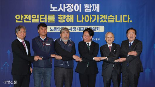 노사정 대표자들이 8일 서울 중구 한국프레스센터에서 열린 ‘노동안전 노사정 대표자 간담회’에서 기념촬영을 하고 있다. 왼쪽부터 류현철 고용노동부 산업안전보건본부장, 양경수 민주노총 위원장, 김동명 한국노총 위원장, 김영훈 고용노동부 장관, 손경식 한국경영자총협회 회장, 김기문 중소기업중앙회 회장.