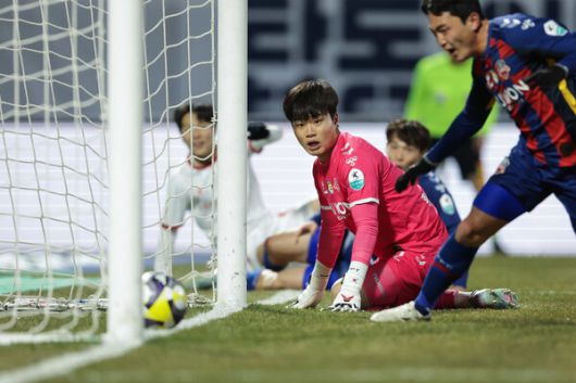 수원FC 황재윤 골키퍼가 7일 수원종합운동장에서 열린 K리그 승강 플레이오프 2차전 부천FC와 경기에서 두번째 골을 내주고 있다. 한국프로축구연맹 제공 |