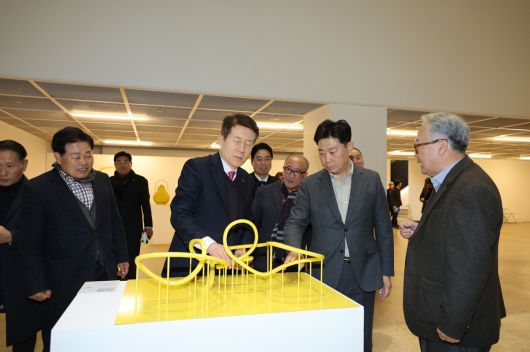 이강덕 포항시장, 이상모 포항문화재단 대표이사, 박용선 경북도의원 등이 8일 동빈문화창고1969에서 진행중인 무장애 전시 '모두의 스틸아트, 손으로 읽는 포항' 작품을 관람하고 있다. 포항문화재단 제공 |